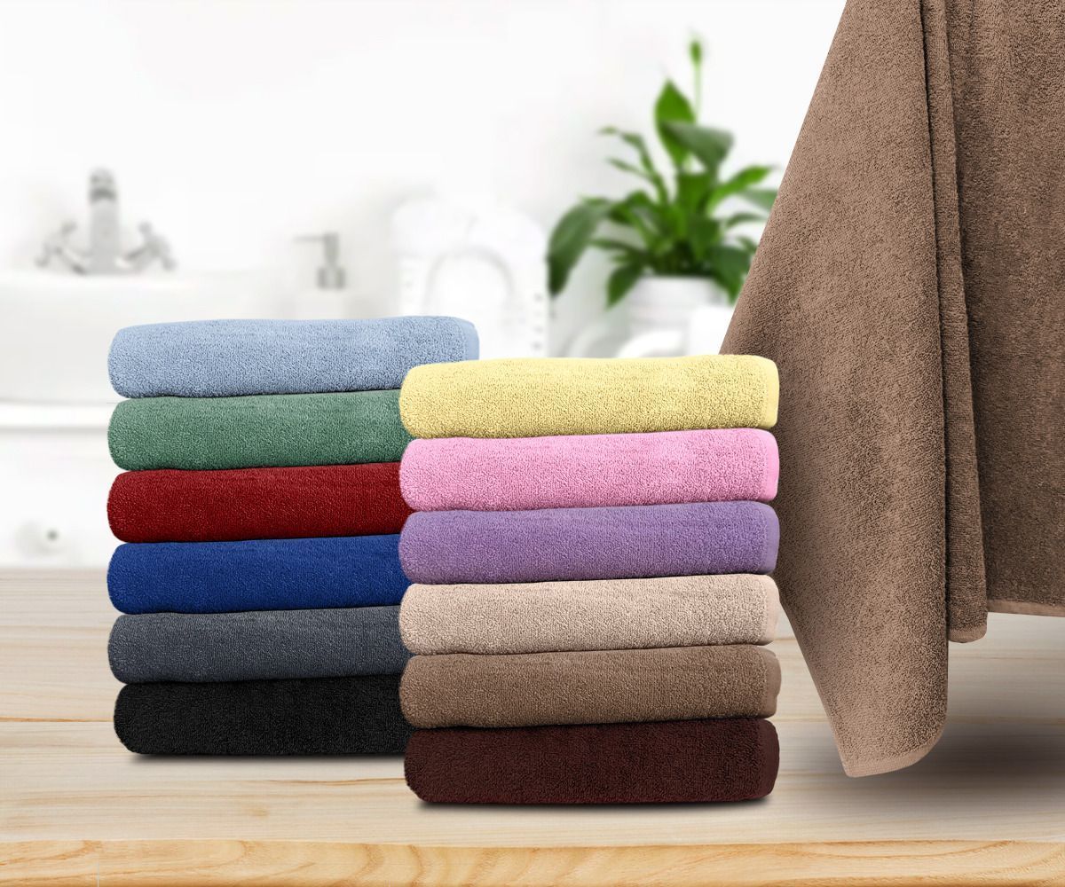 Большая палитра однотонных полотенец от черного до бежевого, с яркими желтыми и бордовыми расцветками, подойдет для всех членов семьи.